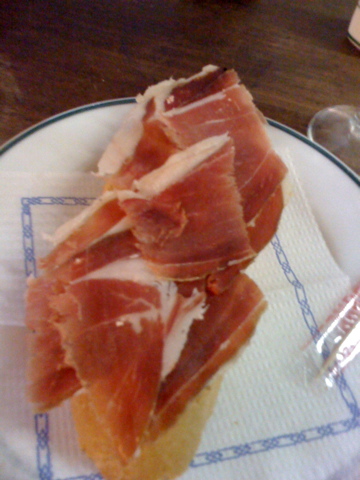 カヴァを頼むと、前菜に出してもらったのは、その場で塊からそいだ生ハム。