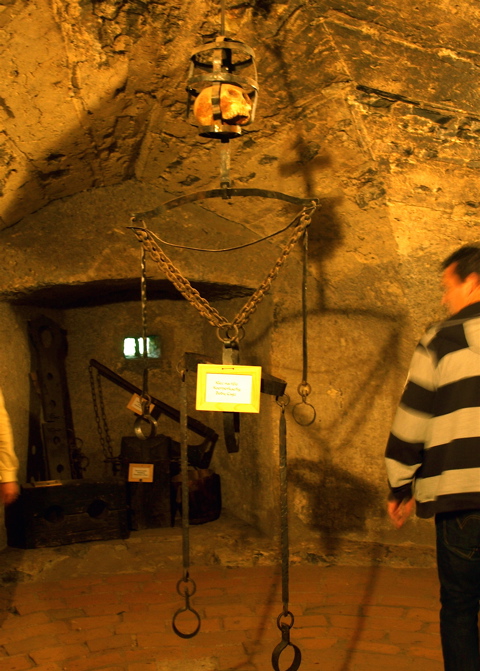 城の地下牢には、当時の拷問具や拘束具の展示が。