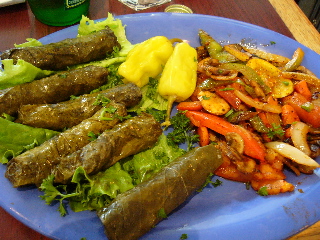ソーセージの様に、スパイスをきかせたラム肉がブドウの葉っぱに包まれている。